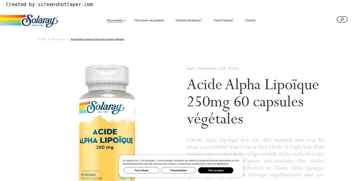 Acide Alpha Lipoïque 250mg 60 capsules végétales  - Solaray