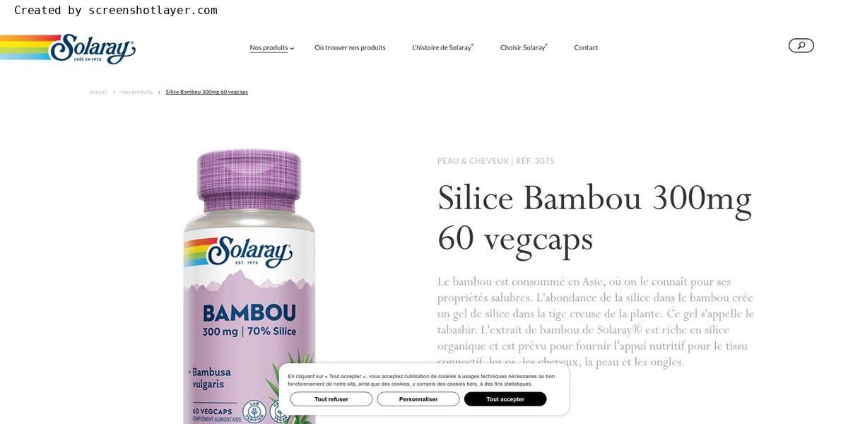 Le bambou est consommé en Asie, où on le connaît pour ses propriétés salubres. L'abondance de la silice dans le bambou crée un gel de silice dans la tige creuse de la plante. Ce gel s'appelle le tabashir. L'extrait de bambou de Solaray® est riche en silice organique et est prévu pour fournir l'appui nutritif pour le tissu connectif, les os, les cheveux, la peau et les ongles.